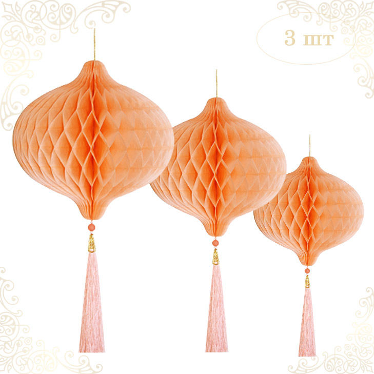 НАБОР бумажное украшение Шары-соты с кисточкой, персиковый - 3шт: