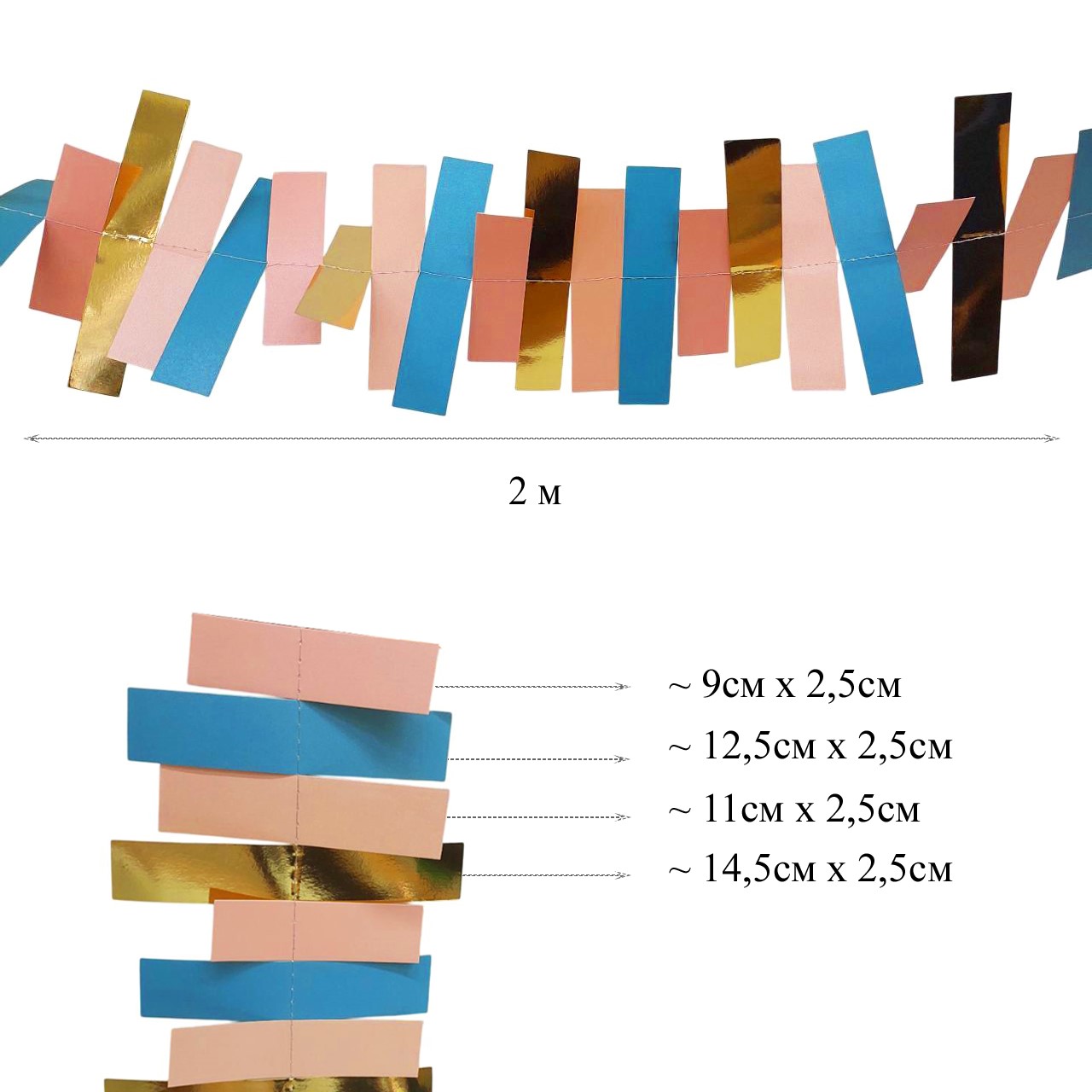 Гирлянда "Прямоугольники" 2 м золото+розовый+бирюзовый