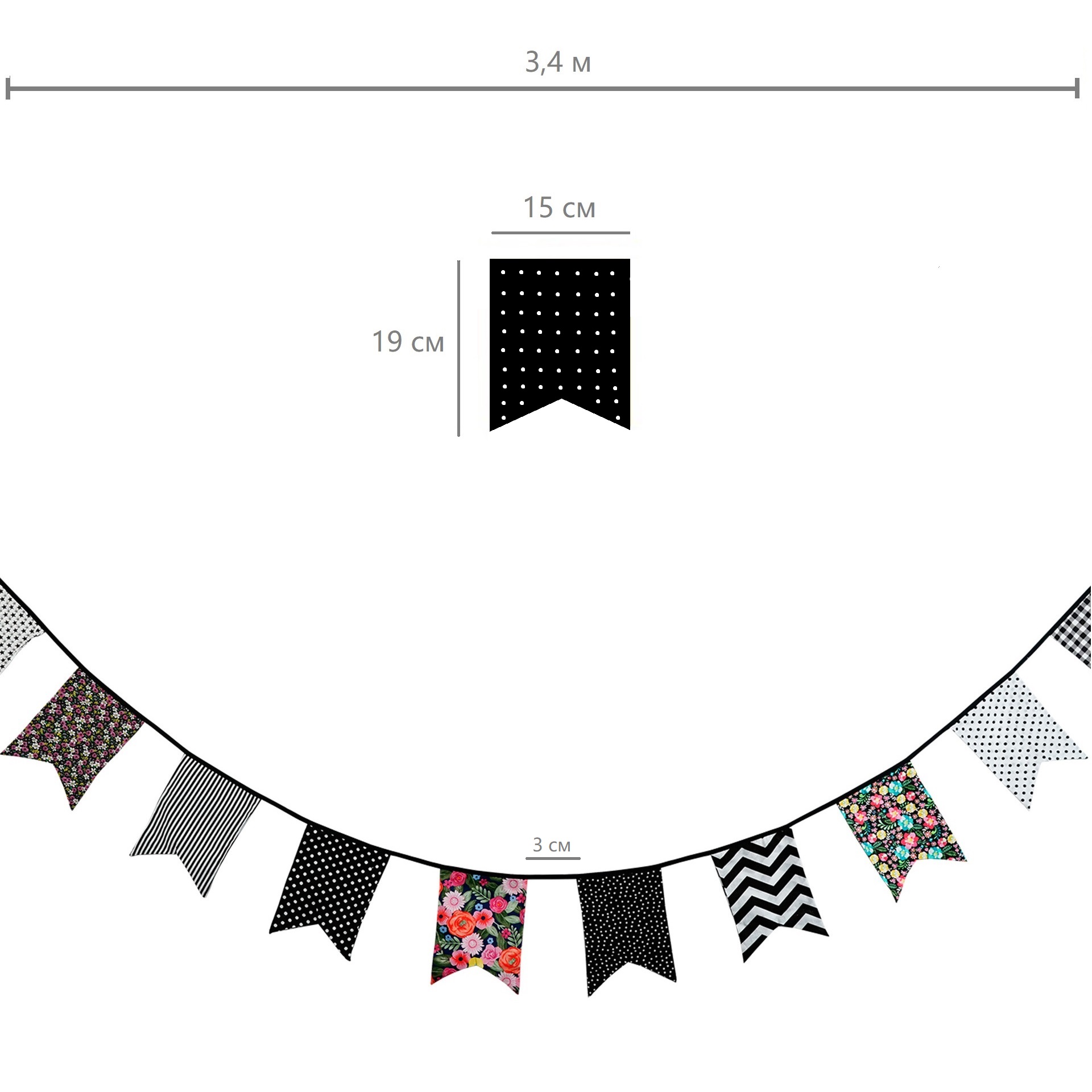 Гирлянда состоит из 12 флажков, общая длина составляет 3,4 м, расстояние между флажками 3 см, длина матерчатых флажков 2,1 м, длина лямок с обеих сторон по 50 см