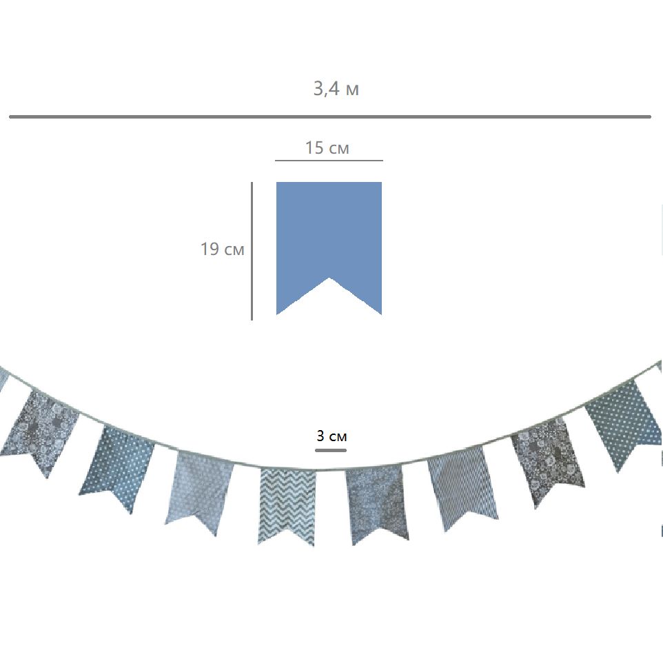 Гирлянда состоит из 12 флажков, общая длина составляет 3,4 м, расстояние между флажками 3 см, длина матерчатых флажков 2,1 м, длина лямок с обеих сторон по 50 см