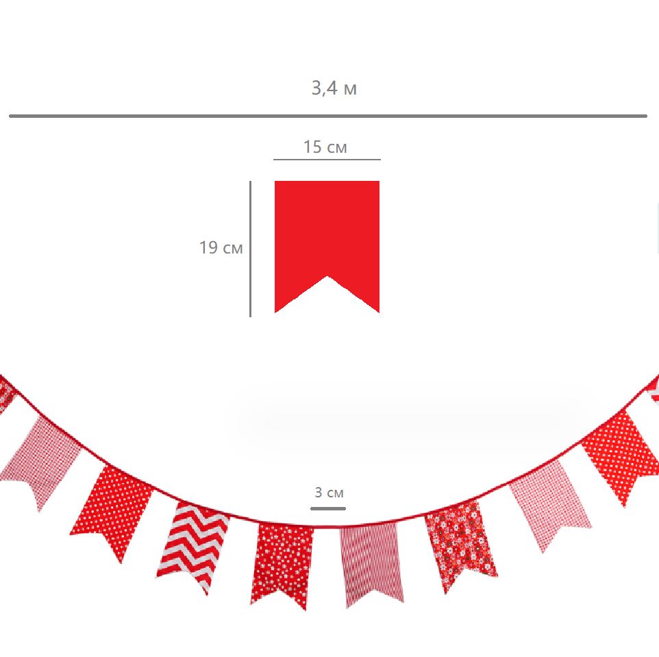 Гирлянда состоит из 12 флажков, общая длина составляет 3,4 м, расстояние между флажками 3 см, длина матерчатых флажков 2,1 м, длина лямок с обеих сторон по 50 см