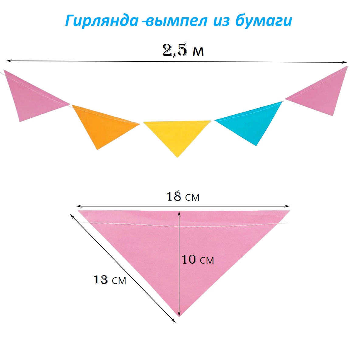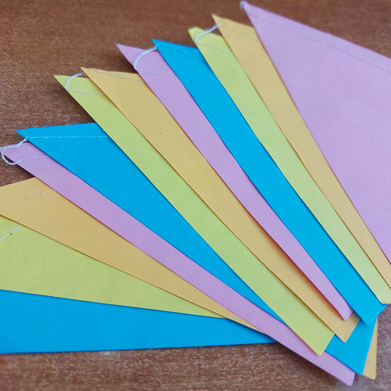 Декоративная гирлянда в форме вымпела, декорированная красочными бумажными двусторонними треугольниками.