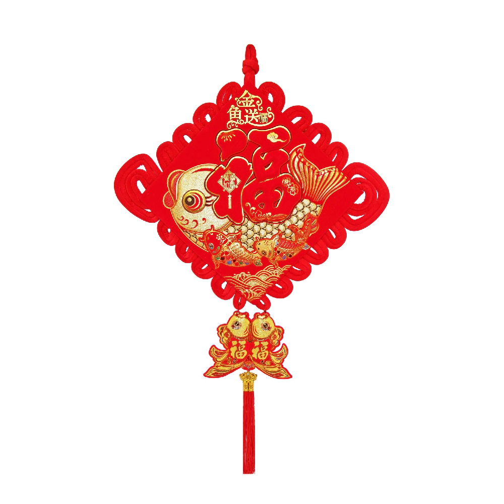 Традиционный китайский узел в форме ромба с символичным дизайном. Яркое сочетание красного бархата и золотых элементов создает эффектный акцент в интерьере.