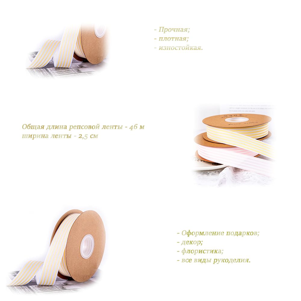 Можно использовать в виде упаковочной репсовой ленты, как жаккардовую тесьму, широко применяется в шитье.