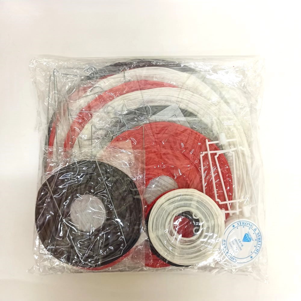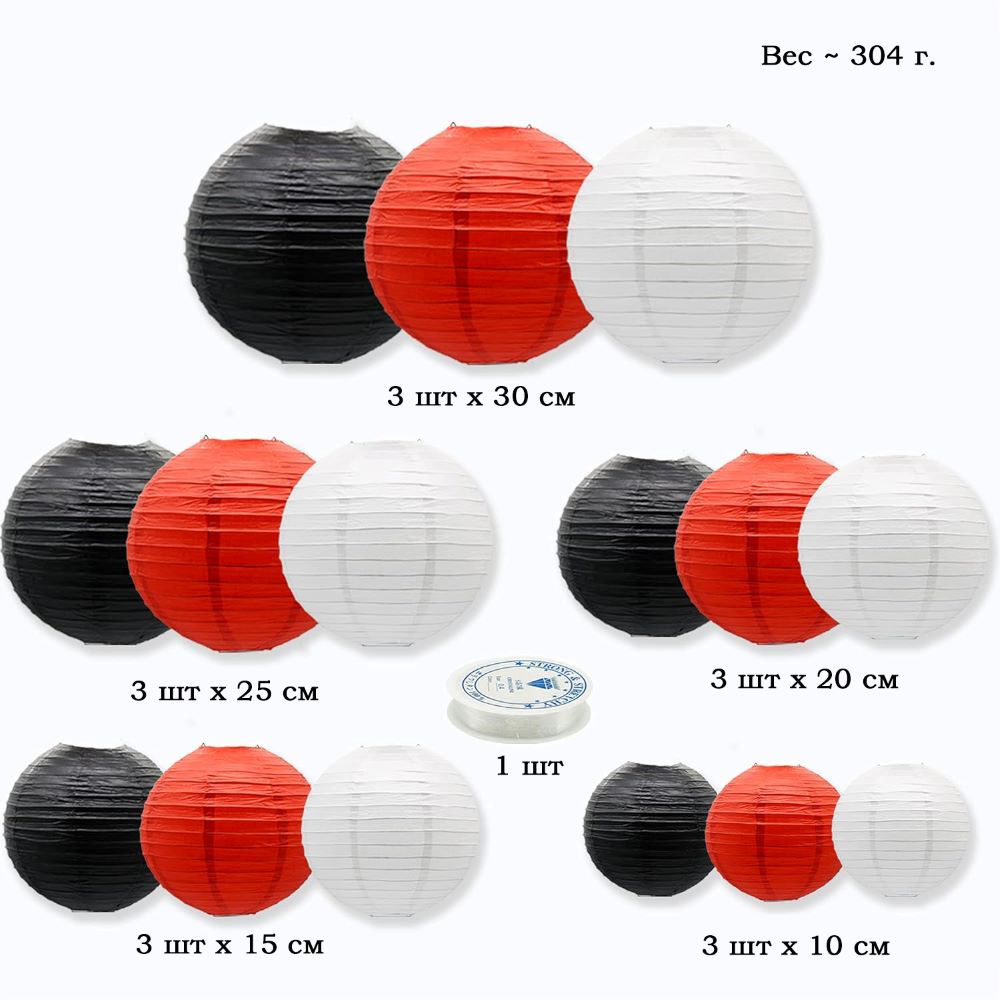 У подвесных фонариков диаметром 30, 25, 20 и 15 см каркас металлический, а у фонариков диаметром 10 см — пластмассовый.В комплекте также идёт леска для подвешивания фонариков в помещении.