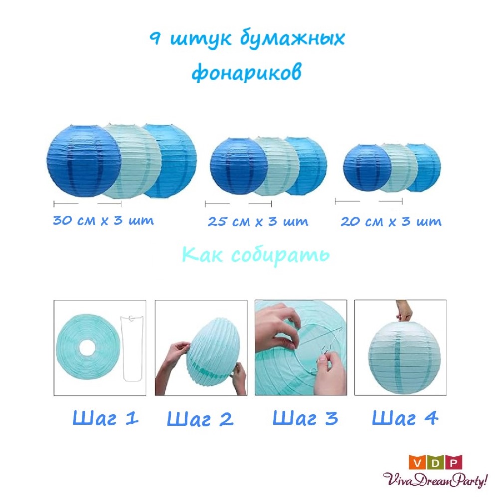 Набор подвесные фонарики 9 шт, голубой+синий+т.синий