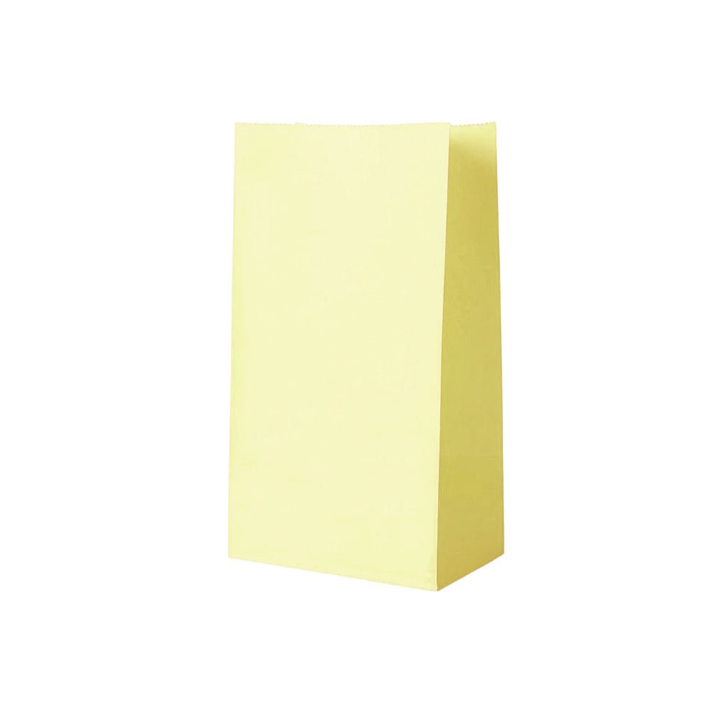 Подарочный пакет из крафтовой бумаги пастельного оттенка с белыми бумажными ручками и белой внутренней стороной.