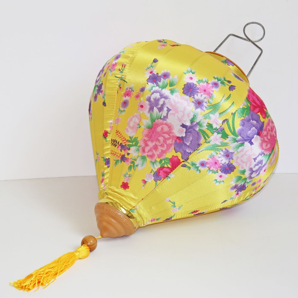 Коллекция подвесных фонарей ручной работы. Конструкция из шелкового полотна с цветочным орнаментом, металлического каркаса и подвесной системы. Модель в желтой цветовой гамме, с цветочным узором.