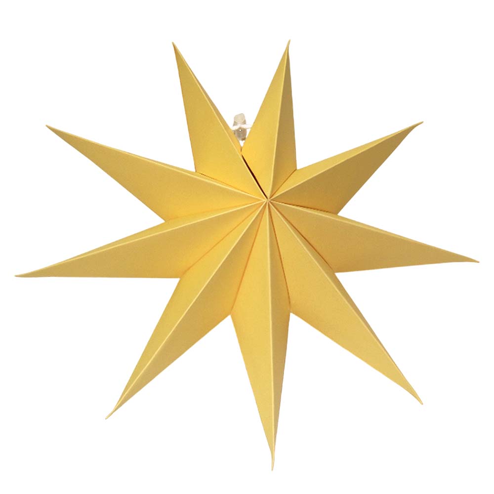 Объёмная декоративная звезда из картона диаметром 30 см с 9 лучами. Оснащена встроенным шнурком для подвешивания. Поставляется в компактном сложенном виде и быстро собирается: специальный шнурок при затягивании придаёт изделию объём и фиксирует форму. После сборки звезда остаётся устойчивой без дополнительных креплений и может использоваться многократно.